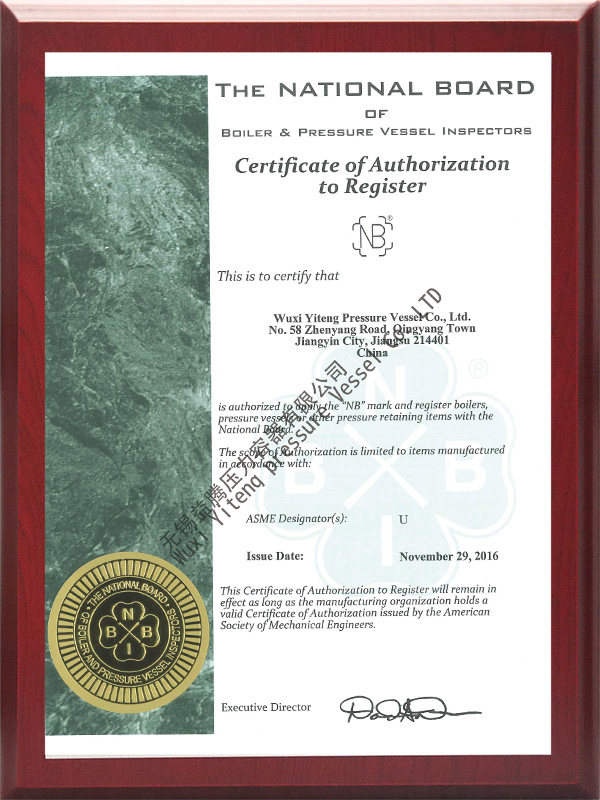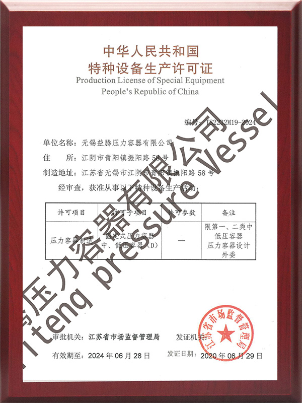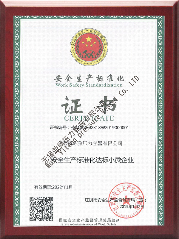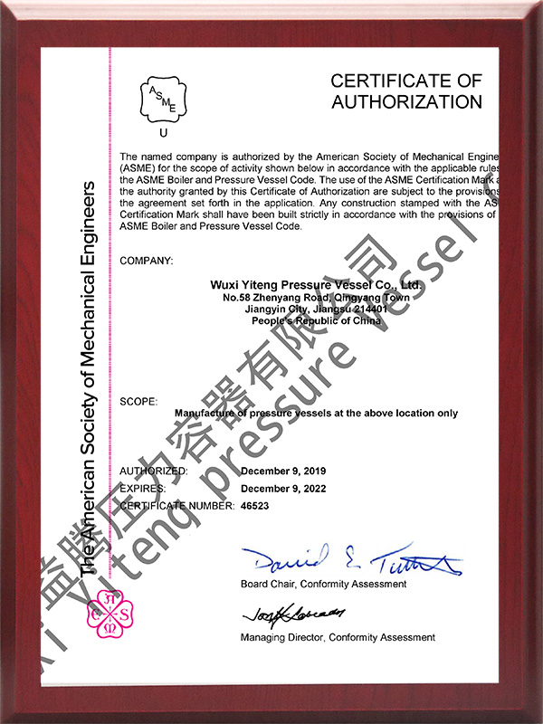 A2設計製造資(zī)質、 ASME U鋼印規(guī)範產品製造資質、 ISO9001質量體係認證、 ISO45001/ISO14001職業健康安(ān)全管理認證、 2023年江蘇省高新技術企業、 完全勝任製(zhì)作ASME/PED/TR-CU/DOSH規範的產品