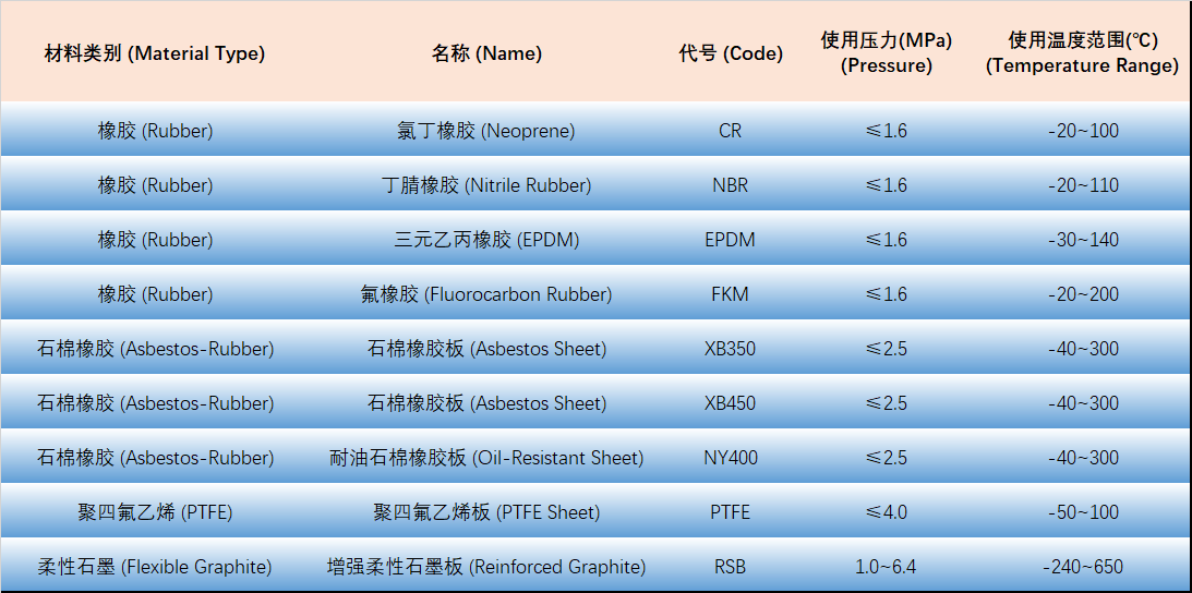 · 橡膠(jiāo)墊(diàn)片:如丁腈橡膠(NBR)耐海水、110℃以下蒸汽;三元(yuán)乙丙橡膠(EPDM)適(shì)用於濕氯氣、鹽(yán)酸等腐蝕(shí)環境。